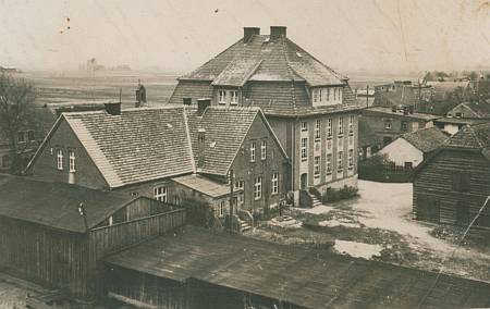2. Szkoła podstawowa w Bobowie fotografowana  z młyna Kaszubowskich. Ze zbiorów prywatnych Jadwigi Górskiej (Maślińskiej), byłej uczennicy i nauczycielki.