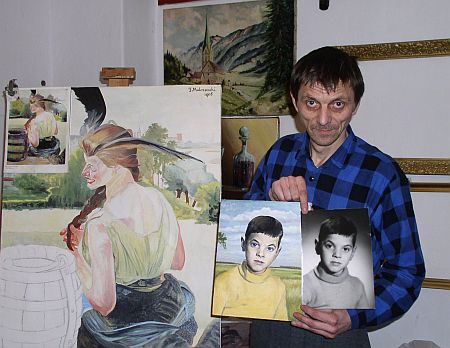 Kujawski ma też talent do kopiowania. Na zdjęciu ze... zdjęciem chłopczyka  i jego malarską  „odbitką” oraz z podmalówką pod Malczewskiego. Fot. Tadeusz Majewski