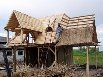 1. Witold Piernicki po raz pierwszy kładzie strzechę na domek. Fot. Tadeusz Majewski.