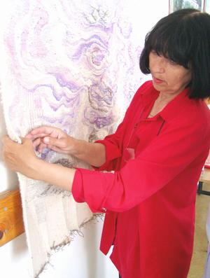 Jak się robi gobelin? - Zaczyna od osnowy, kończy nicią - pada krótka odpowiedź. Ale po chwili idziemy do innego pomieszczenia, gdzie wiszą dwa dużych rozmiarów gobeliny. Misterna robota, nieraz i pół roku pracy po kilka godzin dziennie. Pani Urszula pokazuje, jak kończy się na osnowie jedna barwa, zaczyna druga. Zwiedzamy dalej poplenerową wystawę.