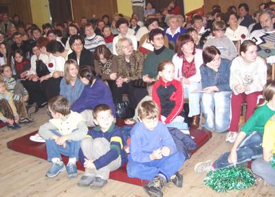 Salka w GOK-u w Kaliskach jest niewielka, gdzieś na 5 stołów do pingponga. I ta salka - proszę sobie wyobrazić - była niesamowicie wypełniona. Naliczyliśmy prawie 300 osób stałych. Do tego przez cały czas trwania imprezy przez salkę przewijali się ludzie. Niektóre dzieciaki stały na parapetach okien. Gęsto było też przy bufecie przed salką i w knajpce mającej siedzibę w GOK-u.