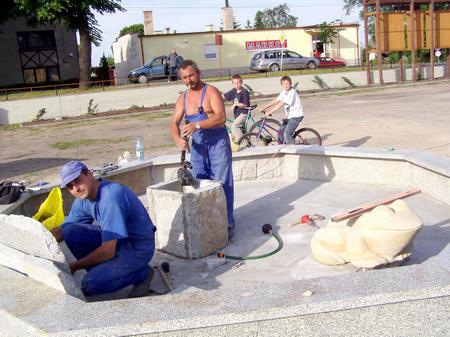 Robimy zdjęcia - pracownicy firmy Sławomira Trawickiego w niecce fontanny murują postumencik, na którym stanie ta mniejsza. To ona ma pluć wodą. O wiele większa Maria Kazimiera siedzi na dnie niecki i tak ma być.