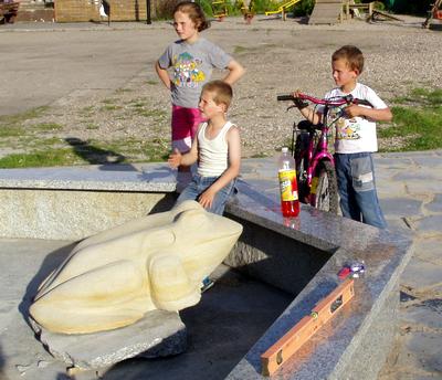 Pracom z wielkim zainteresowaniem przyglądają się dzieci i przez kilkanaście minut ubrani w skórę harlejowcy (po krótkim odpoczynku dopiją piwo, grzecznie postawią butelkę na szosie i ruszą w siną dal). Robotom przygląda się - co zauważamy po dłuższej chwili - wiele par oczu. To ciekawe, ile rozmaitych komentarzy budzą publiczne fontanny. Ktoś coś sobie postawi w ogródku, to jego sprawa, ale tu każdy musi się opowiedzieć. Podobnie było w Skórczu, gdzie fontannę tworzą rzeźby Piotra Tyborskiego.