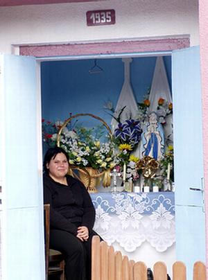 3. Wnętrze kapliczki. W środku siedzi Ewa Kujawska, córka Ireny. Ewa mówi, że często zatrzymują się tu wczasowicze i się modlą. Fot. Dorota Skolimowska