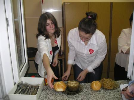 Tym razem stosujemy zasadę "ważnego człowieka" (pchamy się bez skrupułów jak poseł). Na scenie – pokaz mody. Młodzież prezentuje się w strojach ślubnych. - Orkiestra gra u nas po raz trzeci. W zeszłym roku udało nam się zebrać 6,3 tysiąca złotych. Teraz, a jest dopiero godzina 18.40, mamy wynik ponad 4,2! – cieszy się główna organizatorka pani Ewa Chmielecka. Asystuje jej córka Michaelina, prowadząca wraz z Marcinem Derą konferensjerkę. Marcin jest chyba rekordzistą w ilości zebranych serduszek. Ma je na koszuli. Na scenie trwa show. Akurat wychodzi czarna postać o wyglądzie wampira i zaczyna przeglądać gazetę. Głośno kwiestionuje urodę największych gwiazd showbiznesu. Śmiech na sali. Tak zaczyna się początek kabaretu „Pół żartem, pół serio”. Po chwili wbiega druga czarno odziana postać. Z pokaźnym garbem. - Tata, czy ja jestem jakiś dziwny? - pyta czytającego. - Nie, nie jesteś tylko... oryginalny – odpowiada ojciec. Zachodzimy do „Kawiarenki gorących serduszek”. I nagle czujemy głód. Ale tu mają jedynie słodkości, więc wstępujemy do sąsiedniego bufetu na flaki i bigos. - To były najsmaczniejsze flaki w moim życiu – powiedział oblizując się kierownik. Posileni możemy ruszać w dalszą drogę - czeka nas ostatni przystanek, Czarna Woda.