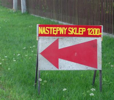 Proszę panią. Co z tymi liczbami? Przed wsią tablice mówią, że drugi sklep jest 1200 metrów, a jest 200 metrów. Czy, jak pójdziemy następne 1000 metrów, będzie trzeci sklep?