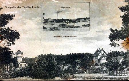 Ma pan dwa stare, oryginalne zdjęcia. Na jednym jest tartak, na drugim dworzec kolejowy i wieża ciśnień. Pana poprzednie opowieści świadczą, że był pan dzieciakiem niezwykle ciekawym świata. Bywał pan na terenie tartaku? - Oczywiście. Na zdjęciu jest tartak, ale wcześniej znajdował się tam też i młyn. Tartak stał przy ul. Lubichowskiej. Dzisiaj nic z tego nie zostało. Młyn i tartak był parowy. Stała wielka maszyna parowa z kotłem równie wielkim, jak kocioł lokomotywy, z długim kominem, obok znajdowała się studnia, z której pompowało się wodę, bo do takiej maszyny trzeba dużo wody. Ta maszyna, od której wychodziły pasy transmisyjne, wszystko poruszała, między innymi dwa traki.