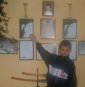 Odwiedzamy Szymona w domu. Jego przyszywany dziadek na wstępie informuje: - Szymek się zawziął. Powtarzał, że jak pojedzie do Francji, to musi coś zdobyć. Ja się z tego śmiałem, a on przyjechał z dwoma medalami. Chłopiec prowadzi nas na piętro, przebiera się w dres. Pokazuje dyplomy. - Zainteresowanie dyscypliną zawdzięczam tacie, który trenował karate i do dziś śledzi wszelkie nowinki sportowe - opowiada. - Zawiózł mnie na pierwszy trening do Starogardu. Zobaczył, że mnie to zainteresowało i że są postępy, więc dowozi do dzisiaj. Kiedyś jeździło z Wdy więcej dzieci, ale teraz zostałem sam... Do Starogardu dojeżdża raz w tygodniu. Trenuje 2-3 godziny pod okiem trenera Krzysztofa Kamysza. W domu codziennie. Jeździ na zgrupowania. Był w Kołobrzegu i we... Wdzie.