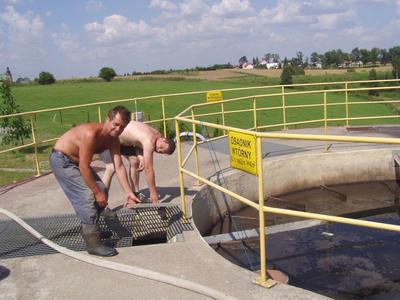 Zaglądamy w dokumentację. 4 sierpień – 126,7 m3 ścieków dowiezionych. Do tego dojdzie około 80 m3 z kanalizy. Razem około 200 m3. Oprócz kanalizacji sanitarnej obok oczyszczalni biegnie kanalizacja deszczowa, tzw. burzówka. Woda z deszczu idzie nią poza oczyszczalnią do jeziora Stare do Zelgoszczy. Jest w miarę czysta. Kiedy pada deszcz, kanalizacją spływa więcej nieczystości. Co to znaczy? Że niektórzy mają do niej podłączone rynny? Może to i dobrze, bo jak są takie nienormalne ulewy, to najważniejsze, żeby w ogóle ta woda zeszła. Mieszkańcy podłączeni do systemu kanalizacyjnego płacą w zależności od tego, ile zużyją wody. Ilość zużytej wody równa się ilości ścieków. Proste. Wyniki oczyszczalni są bardzo dobre. To znaczy, że z oczyszczalni do jeziora Stare płynie woda. Odcedzony ze ścieków osad po wysuszeniu wędruje z wapnem na wysypisko. - Ta praca jest ciekawa – mówi Roman Biernath. – Tu widać, jak z czegoś takiego robi się czysta woda. Pracownicy wlewają tu w dwóch miejscach chemiczny środek, który ma zbić chemię w nieczystościach. Poza tym dbają o teren. - To trzeba trzymać w jakimś porządku, obkaszać, walczyć z bobrami.