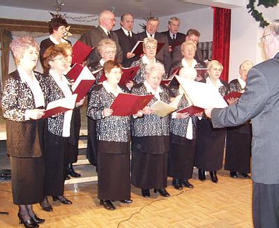 przywitała gości, w tym ks. kanonika Jana Kulasa i przewodniczącego RG Czesława Cichockiego. Po tym chór Klubu Seniora "Jutrzenka" (20 osób), działający pod patronatem GOK-u, śpiewał na tle dzwonów adwentowych "Na wigilię czas". Już się zrobiło nastrojowe.