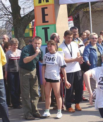 Potem następne konkurencje - w innych kategoriach wiekowych. Mistrz robi rozgrzewki. Chód. Dziwna sprawa. Nogi chcą biec, a muszą iść. - To jest chód, proszę pana - udziela reprymendy nasz człowiek z radia. Dziewczynka, chodziarka (od chodziarz) - zwyciężczyni jednego z chodów udziela pierwszego w życiu wywiadu do RADIA, MEDIÓW. Pierwszy w jej życiu, oby nie ostatni. A teraz marsz OPEN. Korzeniowski namawia wszystkich. Starych i młodych, panie i panów. Za wyjątkiem tych w szpilkach. W tłumku chętnych -  stosunkowo niewielu się decyduje - staje poseł Edmund Stachowicz. Pracowity człowiek, trzeba przyznać.