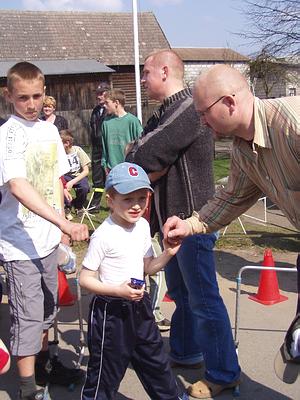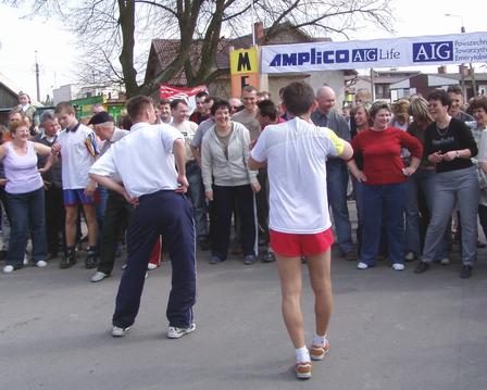 Zaczyna się SHOW sportowy. Najpierw bieg najmniejszych. Ledwo co stanęli na nogach, a już zmuszają do biegu, konkurencji, do walki. Biegnij mały, biegnij, bo inaczej sobie nie poradzisz w życiu. Wygrywa jakiś malec. Tata, ostrzyżony na amerykankę z glancem (po naszemu SKIN) nie może uwierzyć. Przez kilka minut ściska dzieciaka i powtarza - "wygrałeś, wygrałeś". Po twarzy małego widać, że jeszcze się nie orientuje, co to znaczy.