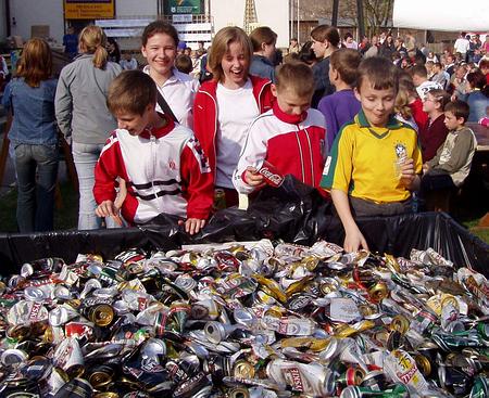Anna Czaja - nauczycielka polskiego i dyrektor szkoły Irena Szczepańska wyjaśniają zasady zabawy. Dzieciaki zbierają puszki przez cały rok i potem oddają na skup. Podobnie jest w innych klubach Korzeniowskiego. Potem jakaś firma losuje i jakiś klub wygrywa pieniądze. Osieczna na przykład wygrała w zeszłym roku ponad 10 tys. złotych na sprzęt sportowy. Puszek w skrzyni jest w tej chwili ponad 6 tysięcy. Zgniotki prawdę mówią co do tutejszej preferencji - numer jeden czarny SPCJAL, numer dwa - Lech.