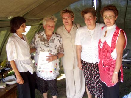 Wiśniewska - przyrządzały m.in. placki ziemniaczane z grzybami leśnymi (ależ to schodziło!). Masowo kupowano też szandary i pierogi. W drugim namiocie panie z Osiecznej - Gertruda Tilsen, Helena Wysocka i Zofia Kolasińska - przyrządzały m. in. wspaniałą karkówkę po cygańsku. W trzecim namiocie panie, również z Osówka - Alicja Narloch, Teresa Talaśka, Maria Platta i Jadwiga Piesik (szefowa KGW) przyrządzały pierogi z twarogiem i kluski. W każdym namiocie natrętnie pytaliśmy, dlaczego - skoro te ich frykasy tak tu schodzą - nie poprowadzą w Osiecznej restauracyjki, choćby na sezon letnio-jesienny. Przyklaskiwała temu wójt gminy Barbara Tomczak. Panie zgodnie odpowiadały, że to by się nie opłaciło. Inną uwagę miała na myśli Alicja Narloch - pierwsza kobieta w Osówku, która poszła na prawo jazdy i pierwsza, która przeszła na rentę strukturalną. Chodziło jej o wiek. - Gdybym miała 30 lat, to bym zaryzykowała - uzupełniła jej wypowiedź koleżanka. No właśnie - a gdzie są ich córki? Już w Londynie?