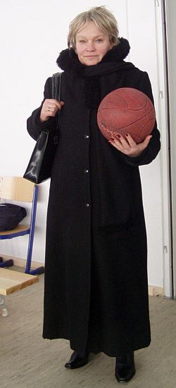 1. Wójt Barbara Tomczak ma wielką ochotę na rzut do kosza, ale ten strój... Fot. Tadeusz