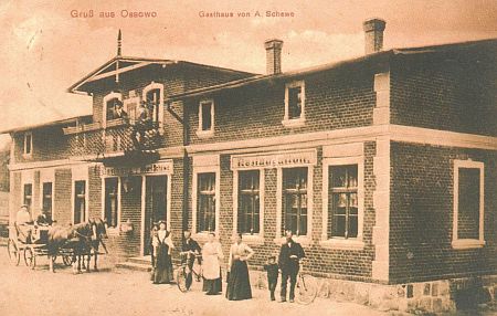 2. Wioski w Borach Tucholskich wcale nie były takie zapyziałe, jakby się dzisiaj mogło wydawać. Weźmy leżące blisko Klanin Osowo Leśne (gmina Lubichowo). Były tu dwie szkoły – niemiecka i polska, a w centrum wsi stała piękna gospoda A. Schewe. Niestety, budynek został przerobiony na dom ludowy. Pocztówka ze zbiorów Muzeum Ziemi Kociewskiej, repr. Dorota Skolimowska