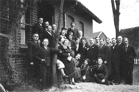Zdjęcia 1. Przed wojną Klaniny musiały być znane jako pełna uroku miejscowość, jeżeli inspektor szkolny zorganizował tu konferencję rejonową. To zdjęcie, ze zbiorów Zbigniewa Sakowskiego, już prezentowaliśmy, prosząc Czytelników o podpowiedź, gdzie to jest. Teraz już wiemy – to Klaniny. Jeden z Czytelników rozpoznał po zaślepionych oknach po prawej stronie drzwi i po wąskim oknie po lewej. Na zdjęciu pierwszy z lewej Ignacy Gliński (Mościska), drzewo obejmuje Otton Simon (Osowo Leśne), siódmy z prawej stoi kierownik szkoły w Borzechowie Leon Wieczorek, obok niego z prawej – Beim (Klaniny). Ze zbiorów Zbigniewa Sakowskiego. Repr. Dorota Skolimowska