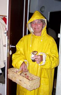 Znowu otwierają się drzwi. W żółtym płaszczu przeciwdeszczowym wchodzi siostra Urszuli - Teresa Rutkowska. W dowód, że są już grzyby, pokazuje prawdziwka.
