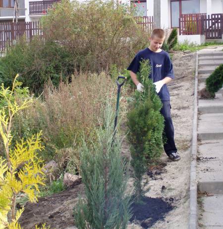 Żywotniki i cisy sadzą właśnie za Miejskim Domem Kultury, obok stworzonej tu enklawy - tak zwanej Zielonej Świetlicy z drewnianymi siedziskami i grillem. To tu za kilka dni ma się odbyć Burmistrzowe podsumowanie lata. Świetne kompozycje przed szkołą podstawową i gimanzjum.