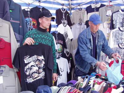 Panowie Grzegorz i Zbyszek przyjechali tu z Czerska. W ich obszernym namiocie mogą kupić koszulki między innymi hiphopowcy i metalowcy. Sami handlowcy są ubrani praktycznie, czyli na luzie. Mają obowiązkowo czapeczki i saszetki u pasa. Jeden z nich pokazuje spracowane, nieco brudne ręce.