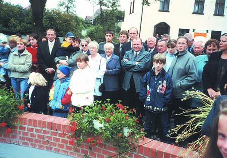 Foto. Mieszkańcy Skórcza w dniu "otwarcia" fontanny. Od początku budziła kontrowersje - dla jednych, jak dla A. Gawlika - "tragiczna, dla drugich bardzo interesująca.
