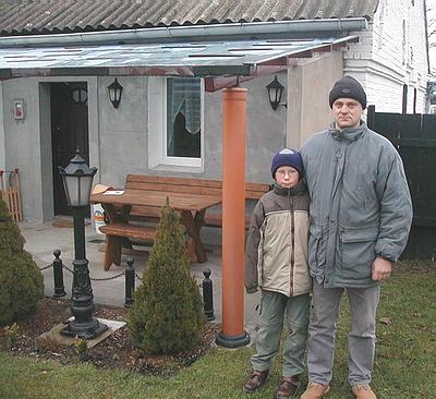 Młodzi Piotr i Alicja Grothowie odziedziczyli w 1997 r. po wujku Kazimierzu zaniedbaną zagrodę. Dziś jest ona dumą wsi. Zaprowadziła nas do niej sołtys Irena Muszyńska. Nowy właściciel zabrał się od razu do porządkowania obejścia. Powycinał stare drzewa, krzaki, uprzątnął chaszcze. Potem zlikwidował walącą się stodołę i powyrzucał śmieci - stare szmaty i butelki. Wraz z żoną zajęli się ogrodem. Posiali trawę i posadzili kwiaty. Później zrobili oczko wodne. Początkowo było pustawo, na efekt trzeba było trochę poczekać, ale było warto. Dziś widać rekreacyjny ogród z wymurowanym na stałe grillem, estetyczną huśtawką dla dzieci i kącikiem wypoczynkowym. Jest gdzie posiedzieć latem, pobawić się i pokazać gościom. - Tu wszystko tak zarosło, że widoczny był tylko dach. Dziś jest ślicznie. Ale prawdziwy urok widać latem. Nawet nie wszyscy miejscowi wiedzą, że tu tak ładnie poprzerabiane - mówi sołtys. Aby przenieść się z Gdańska i zamieszkać z całą rodziną w budynku, który też pozostawiał wiele do życzenia, trzeba go było zmodernizować. W końcu Grothowie mieszkali w miejskim bloku, gdzie było ciepło i czysto. Poprzestawiał ściany działowe, żeby było wygodniej. Następnie zajął się centralnym ogrzewaniem i łazienką. Chciał mieć na wsi luksus jak w Gdańsku, gdzie mieszkał od urodzenia. I ma. Grothów mają pół hektara ziemi, resztę oddali w dzierżawę. Właściciele liczą na unijne pieniądze. Jak tylko je otrzymają, podniosą górę domu. Teraz mieszkanie ma 83 metrów kwadratowych. O tyle chcą powiększyć. Dzieci, troje, rosną i będą potrzebowały coraz więcej przestrzeni. Dlaczego właśnie tu? - Od dziecka przyjeżdżałem do wujka na wakacje. Zawsze dobrze się tu czułem, więc z chęcią przyjąłem darowiznę. Cieszę się, że całej mojej rodzinie się tu podoba. W ogrodzie wyżywa się już tylko żona. Ona pilnuje jego uroku. Czasem radzi się mnie w sprawie kwiatów czy krzewów, ale coraz rzadziej. Dba tez o mieszkanie. Do mnie należy reszta. Obyśmy tylko byli zdrowi. Ochoty do pracy na pewno nam nie zabraknie. Tekst i foto Teresa Wódkowska 1. Alicja Grotha z pięcioletnimi bliźniaczkami - Dominiką i Klaudią 2. Piotr Grotha z synem Michałem