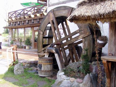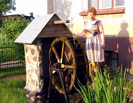 Bardzo malowniczy był na przykład kiedyś wiatrak. Może dlatego mamy ich pod dostatkiem (co prawda maleńkich). Trudno wśród tych klamotów o nowości. Ale wypatrzyliśmy. Otóż w ogrodzie Teresy Pasterskiej w Kamionce stanęło chyba pierwsze w powiecie koło nasiębrne. Co to takiego? Koło, które obraca się pod  wpływem spadającej nań wody (na się bierze - nasiębierne). Dawniej pracowało - dawało energię - młynom lokowanym obok strumieni i spiętrzeń wody. Ponieważ  Kamionka leży na płaskim terenie, mąż pani Teresy zbudował nad sztucznym stawkiem kamienną górkę, przy pomocy rurek doprowadził ze stawku na szczyt wodę (obieg zamknięty) i spuścił ją na owe koło. Kręci się nawet zimą. Zapewne po tym tekście powstaną koła znacznie większe, na wzór pokazanego na drugim zdjęciu - znajdującego się przy zajeździe pod Ostródą. Na pierwszym zdjęciu koło prezentuje Teresa Pasterska. Za tygodnikiem Kociewiak- dodatek do piątkowego wydania Dziennika Bałtyckiego.