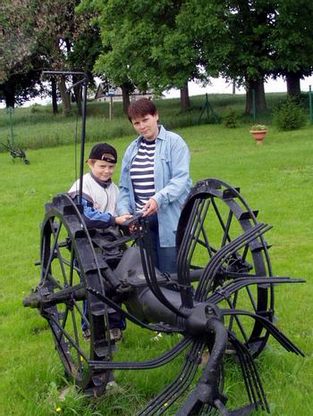 - Pomysł na urządzenie ogrodu właściwie zrodził się sam – opowiada jego właściciel. – Ziemia leżała odłogiem. Był też kawałek łączki, nic ciekawego. W 2000 roku postanowiłem wykopać oczko wodne i postawić kamienne kwietniki. Kupiłem kilkanaście rybek, karpie, liny, karasie. Ryby szybko się rozmnożyły. A w oczku wodnym rozrosły się krzewy wodne. Z jednej doniczki. Z pomocą kolegi zbudowałem wiatrak. Na pozostałej części ogrodu poustawiałem maszyny i narzędzia rolnicze, na których pracował mój ojciec i ja. W 2 lata później pan Jan razem z 6-letnim Kajtkiem i 10-letnim Piotrusiem pomalowali je na czarno, posiali trawę. Żona Katarzyna posadziła krzaki i krzewy. Są też kwiaty - turki, fiołki, szałwie, petunie, surfinie i inne. – A dzisiaj przed chwilką posadziłem choinkę, którą Kajtek (Grześ) wygrał w szkole za zbiórkę makulatury – mówi z dumą pan Jan. - Ten ogród jest trudny w utrzymaniu, ale jakoś sobie radzimy. Cieszy nas, że podoba się ludziom. To cała zapłata za nasze staranie – dodaje pani Kasia |
