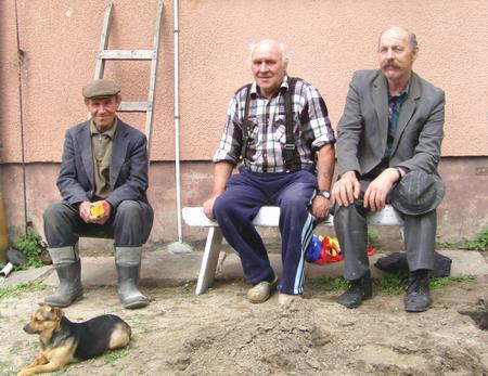 kasetonów, a kwiatki odlał w formach z podstaw... plastikowych butelek. W kapliczkę, która jest pusta w środku, wkomponowane są obrazki: Serce Jezusa i Matka Boska Niepokalana. Niektóre obrazki pan Edward kupił - jeden, stary, zdjął ze ściany swojego mieszkania. Figurkę Matki Boskiej dał Jan Wrzałka. Przy budowie panu Edwardowi pomagają Stanisław Osowski, Jan Jankowski i Józef Pawelec. Obecnie dookoła kapliczki powstaje ogrodzenie. Panowie są dumni ze swego dzieła. Zdjęcie kapliczki ukazało się już w "Pielgrzymie". Foto1 Krótka przerwa w pracy. Edward Wrzałka (od lewej), Jan Jankowski i Stanisław Osowski mówią, że najtrudniejsze zadanie to dobranie odpowiednich kolorów.
