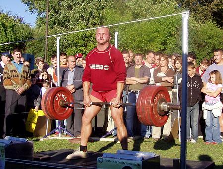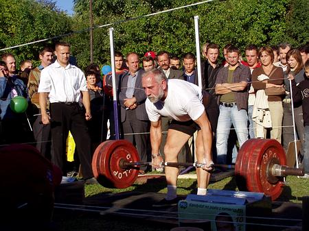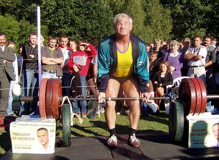 Znowu wróćmy do zawodów w Bolesławowie. Stosunkowo drobny jak na siłacza człowiek podchodził i podnosił coraz większe ciężary w ciągu martwym z żelaznym uchwytem, czyli podchwytem. Z wysokości 30 cm do pasa. I w tej konkurencji jest zapisany w Księdze Guinessa. Podnosił coraz więcej, już blisko swojego najlepszego wyniku... 401 kilogramów, co jest absolutnym rekordem świata.