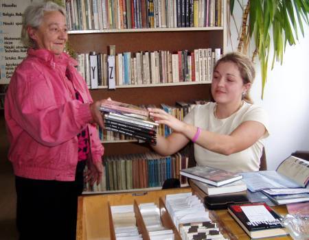 Foto Pani Maria Otta zdaje pani Emilii „porcję” książek. Przeczytała ich 13 w ciągu dwóch tygodni. Fot. Marek Grania |