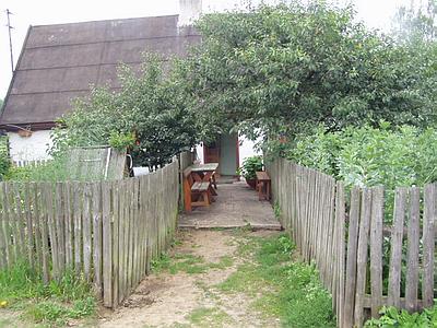 Obejście zacienione starymi drzewami. Od tych drzew po deszczach idzie wilgoć. Pod płotem stoi kilka klatek na króle, na ścianie chlewa budki dla ptactwa. Obraz gospodarstwa jak sprzed wielu, wielu lat.